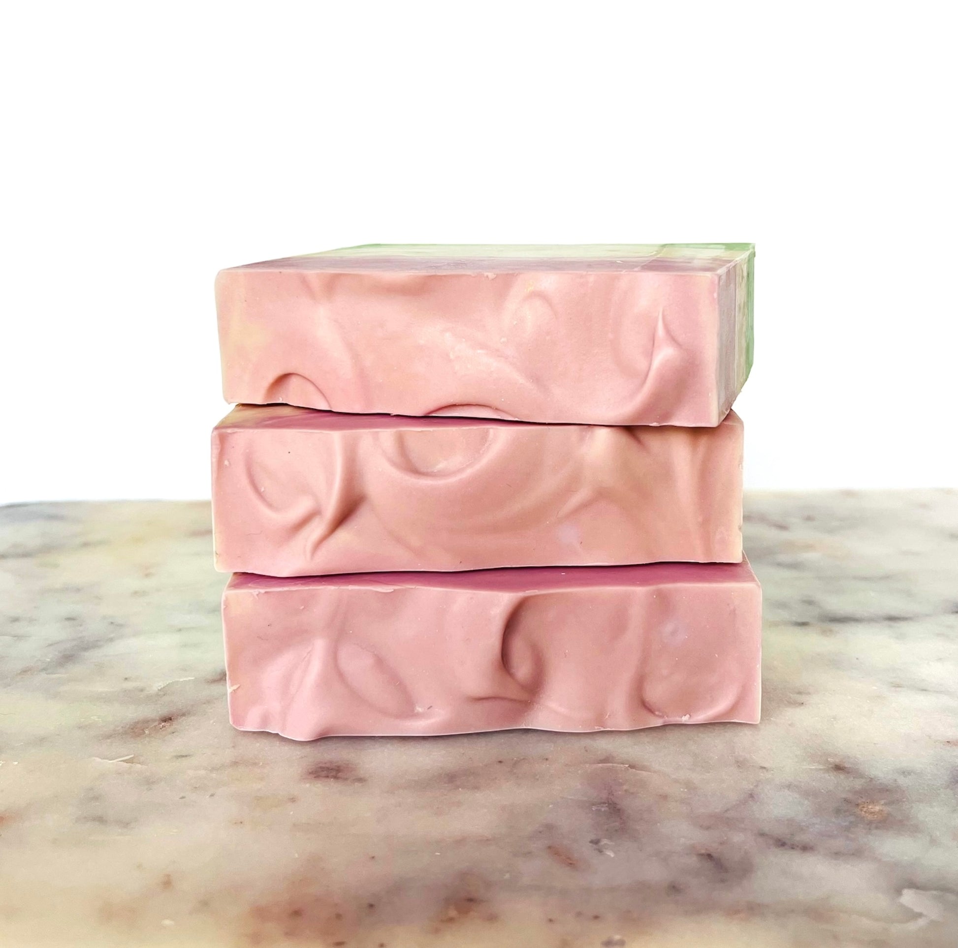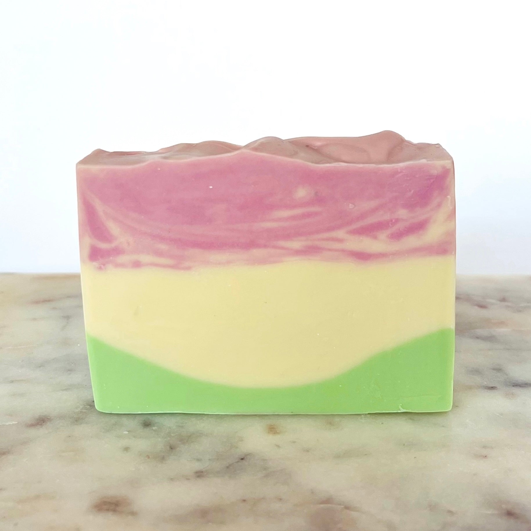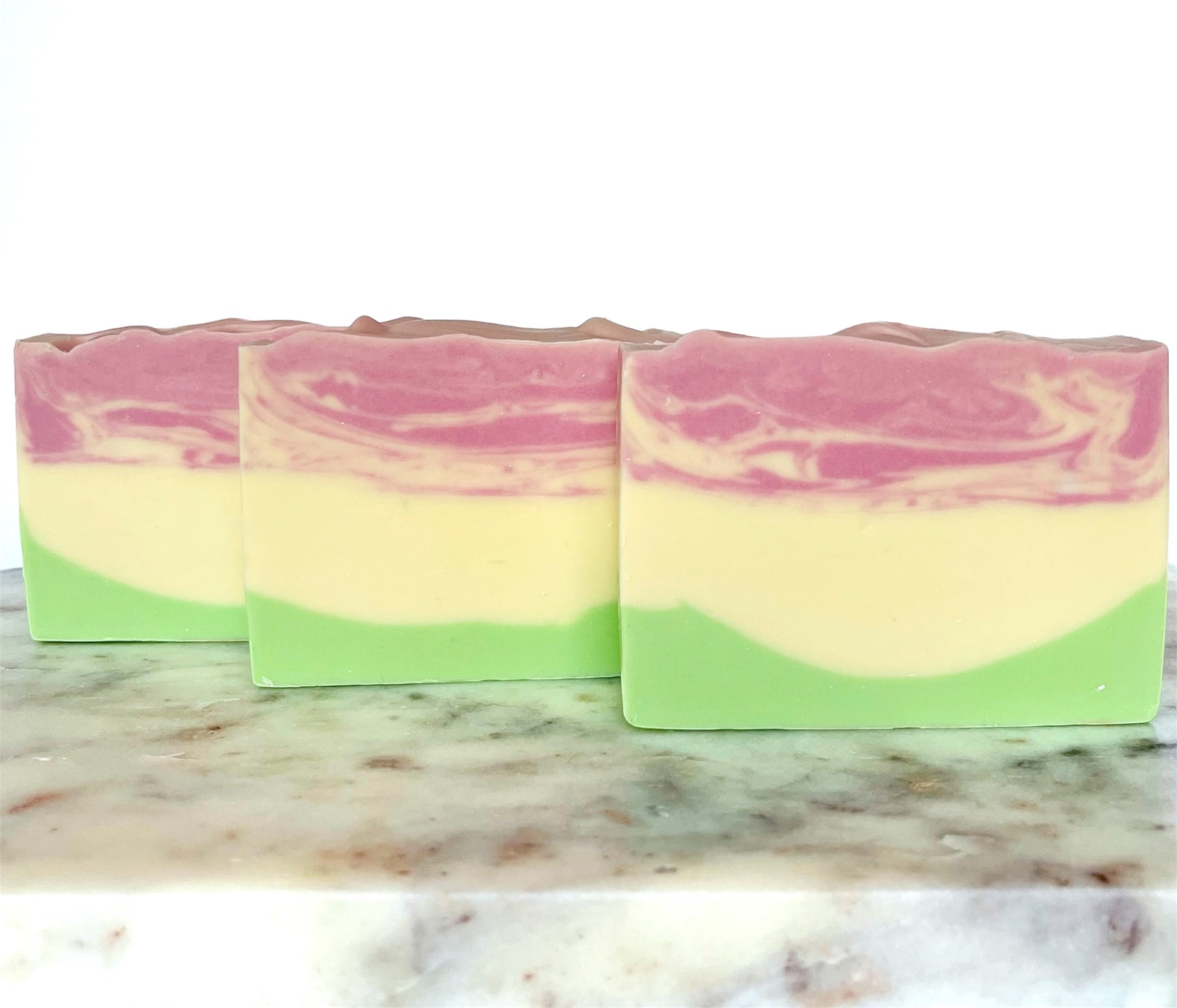 Olive oil, coconut oil, palm oil, water, lye. castor oil, sweet almond oil, fragrance, mica, titanium dioxide